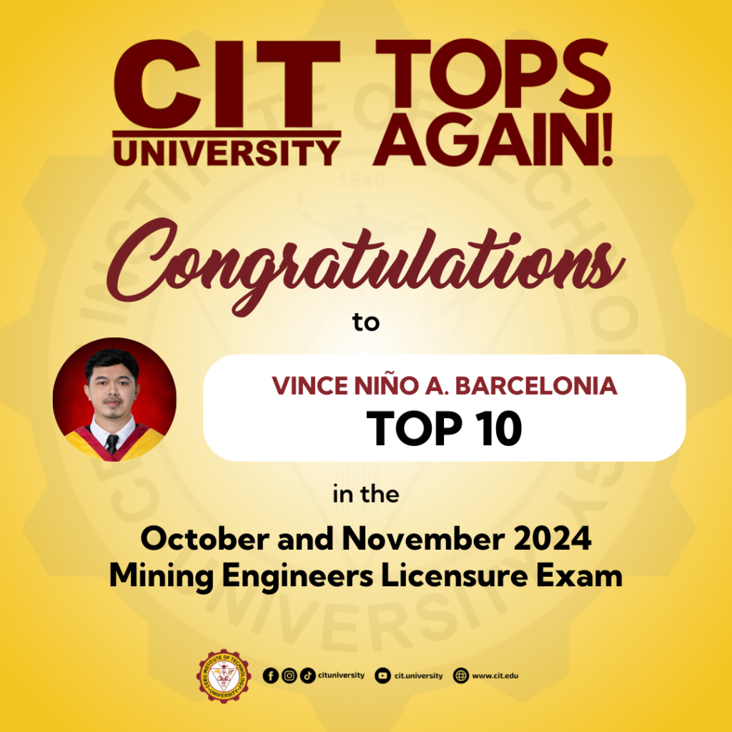 Joining him in this wave of success is Vince Niño Alegada Barcelonia, who secured the Top 10 spot in the October and November Mining Engineers Licensure Examination with a stellar rating of 86.75%. Barcelonia’s milestone reflects not only his personal determination but also CIT University’s growing reputation for producing top-caliber professionals. His achievement also highlights CIT University’s back-to-back top performances, following its recent victory in the November 2024 Chemical Engineers Licensure Examination.